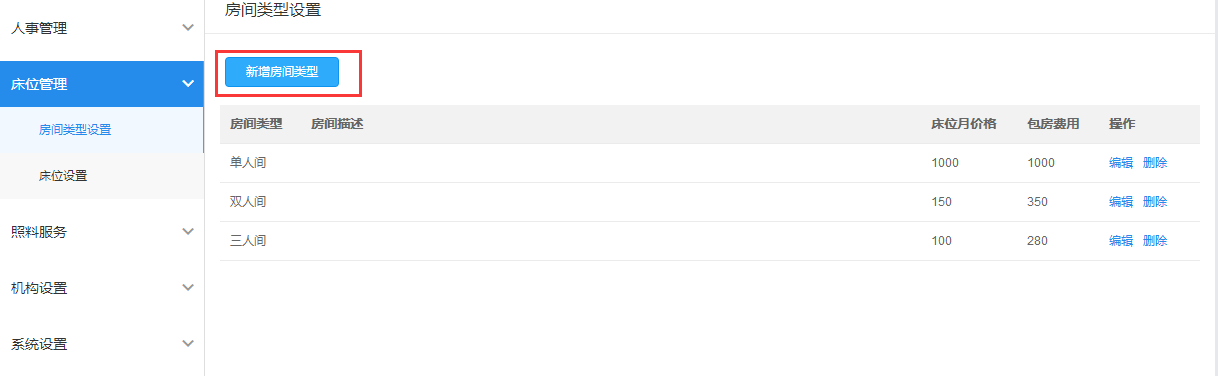 在床位设置前先进行房间类型设置,设置完成后再单独新增楼栋、楼层、房间和床位,也可批量新增床位。