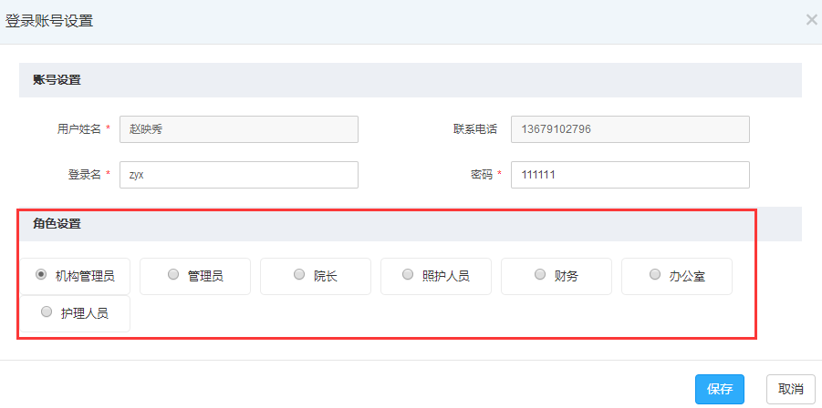 老人办理入住和新增员工信息时,在人员类型下拉框里选择即可。