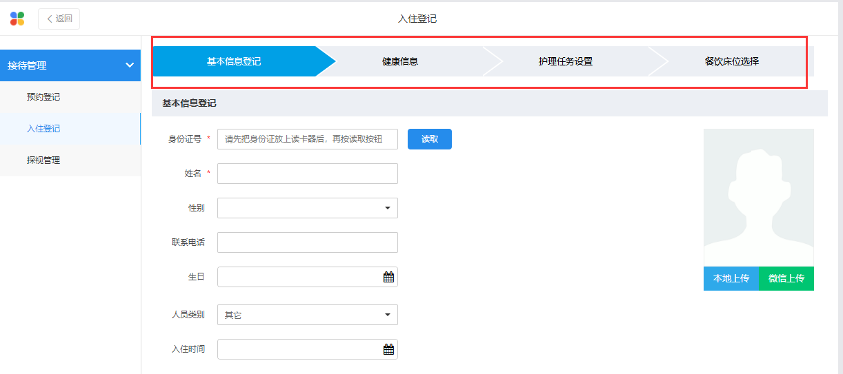 在“接待管理”-“入住登记”模块中进行老人基本信息、健康信息、护理信息、餐饮类别和床位信息的设置,完成后点击“保存”即可。