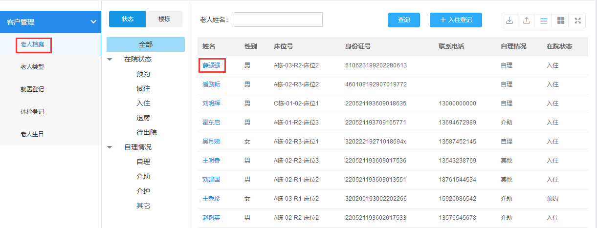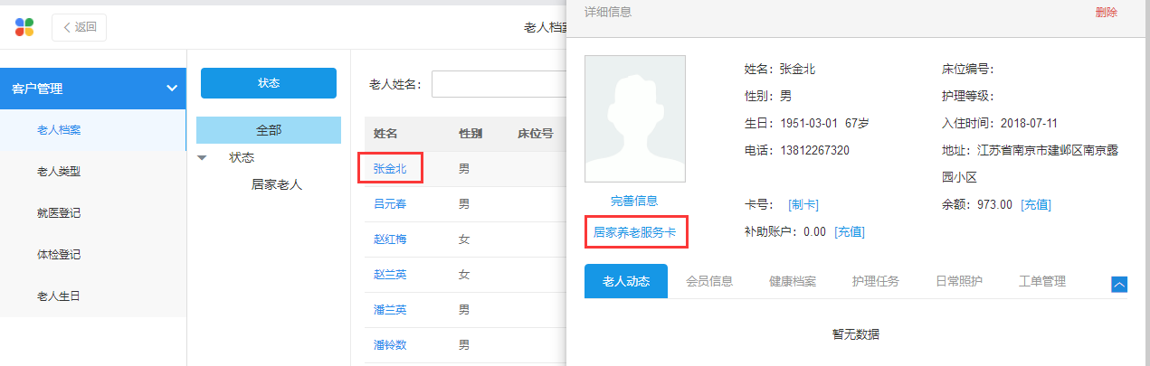 在“客户管理”-“老人档案”中点击需要更换相关信息的老人的姓名,然后在详细信息里进行修改即可。