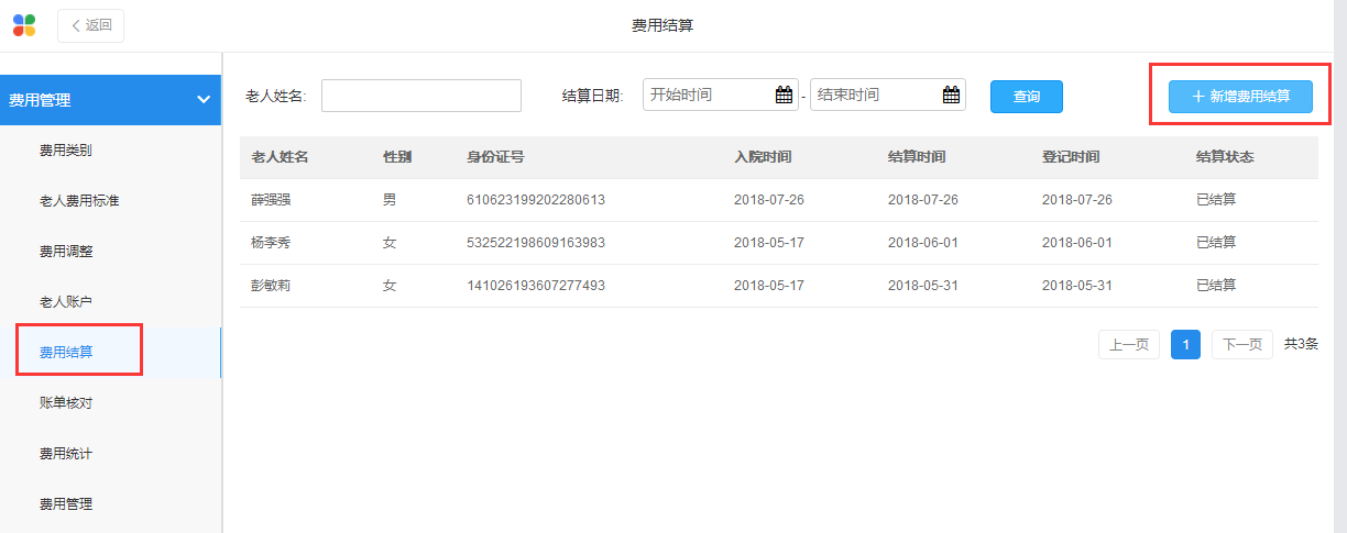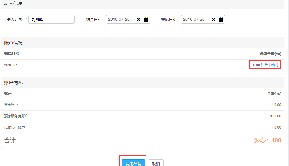 老人在出院登记前首先要进行费用结算,在“费用管理”-“费用结算”模块中进行账单核对和费用结算后,再在“居住管理”-“退房管理”中进行出院登记,完成登记信息即可办理出院。