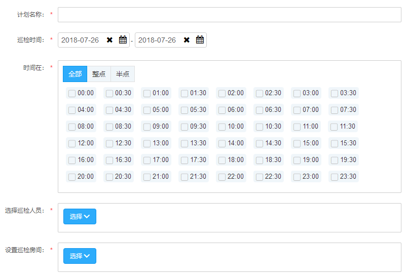 在“巡检管理”-“巡检计划设置”模块中新增巡检计划,选择时间点、巡检人员和巡检房间即可。