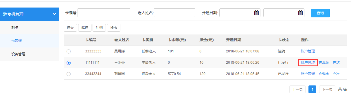 在“消费机管理”-“卡管理”中选择卡状态为已发行的需要充值的老人,可为其账户充值现金、退费、充次、清零、查看以及交易记录明细。