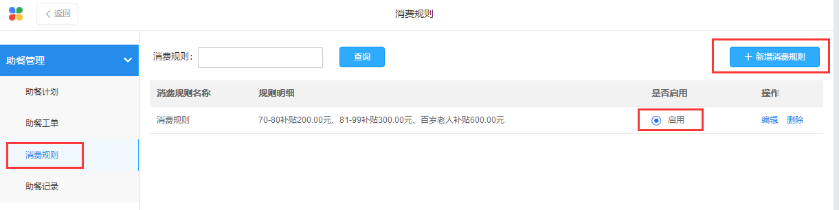 在助餐、助浴模块里的消费规则中新增消费规则,进行补贴设置,设置完成后点击“启用”即可。