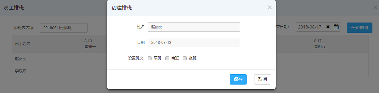 在“人事管理”-“员工排班”中点击“新增”,填写好排班表名称、选好人员和日期后开始排班,再为其员工设置班次。