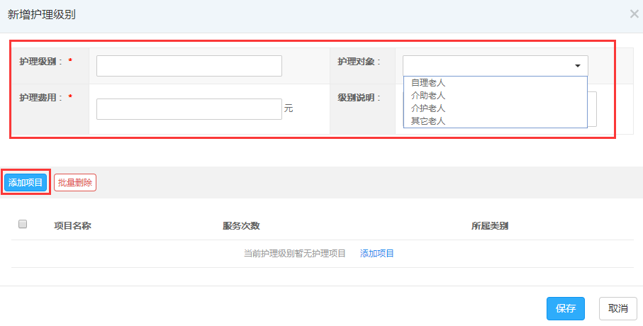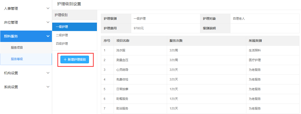 先新增服务类别和项目,新增完成后再添加护理级别以及该级别下的护理对象、护理费用和护理项目,全部设置好后即可。