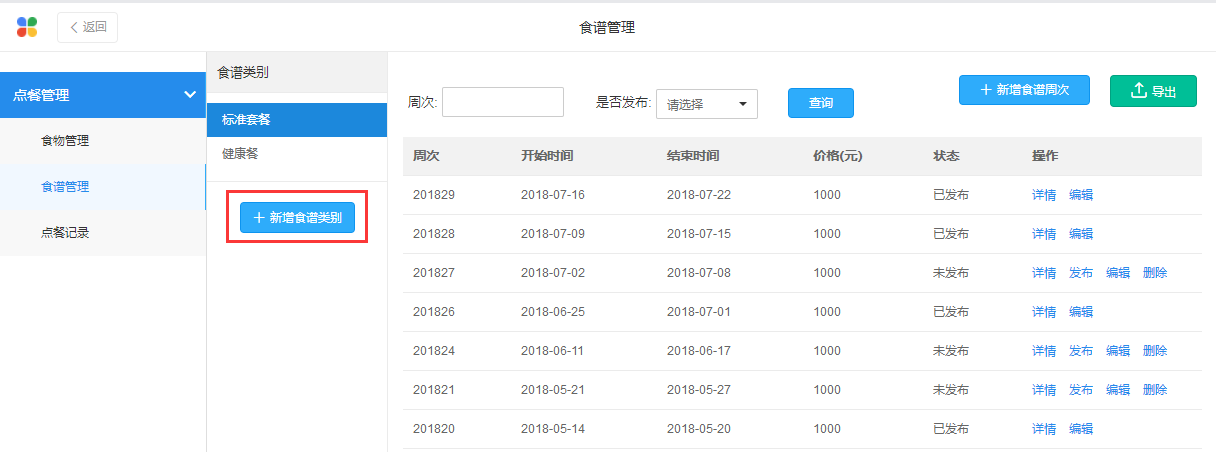 在“点参管理”-“食谱管理”中先新增食谱类别,再新增食谱周次,添加好后再发布,发布后该条记录无法删除。
